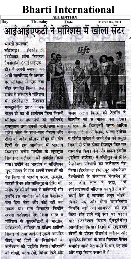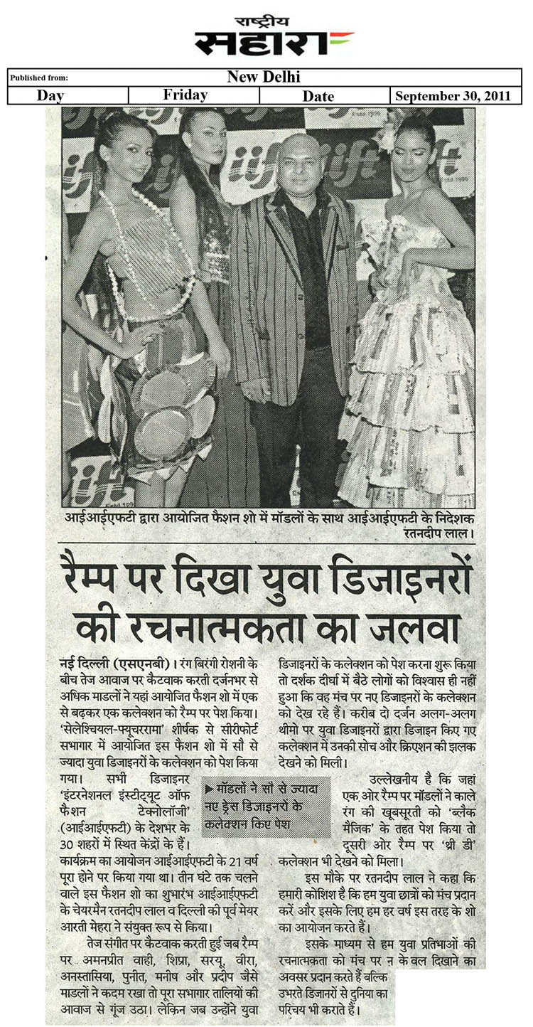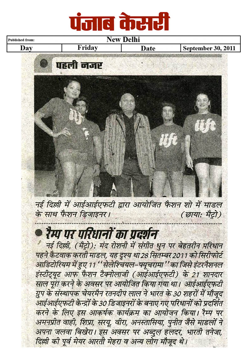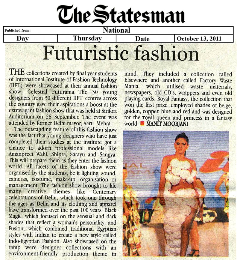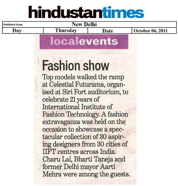 Sr Manager IIFT Group- Prateel Lal was judged Best Fashion Student award by Indian Federation of Fashion Development (IFFD) in India Fashion Summit, Aug 2012 New Delhi |